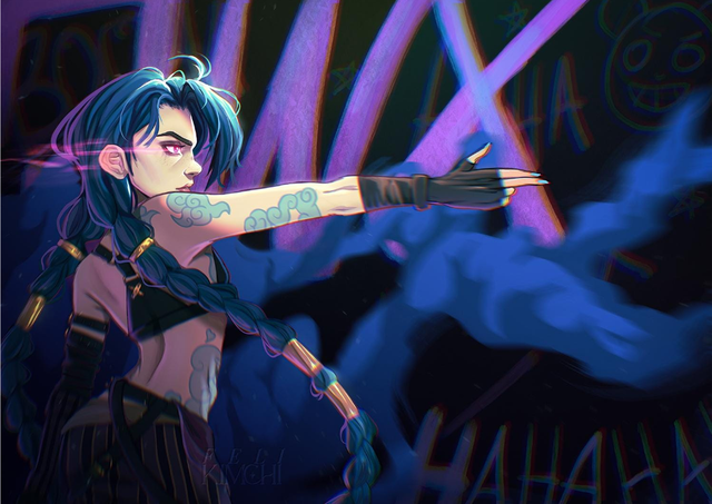 The artwork features Jinx from the Series Arcane / the Game League of Legends drawn by me. NOT AI GENERATED!